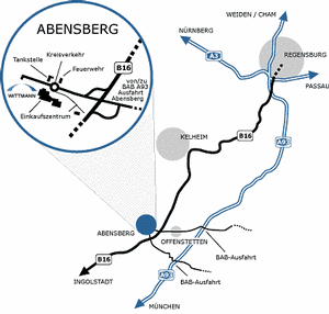 Auf der Bundesstraße 16 (B16) Richtung Ingolstadt an der Ausfahrt Abensberg abfahren und rechts weiter Richtung Abensberg. Nach ca. 100m am Kreisverkehr geradeaus fahren Richtung Innenstadt, nach ca. 300m auf der linken Straßenseite befinden sich unsere Geschäftsräume. Parkmöglichkeiten bestehen auf unseren Kundenparkplätzen hinter dem Haus. Die Zufahrt befindet sich direkt nach unserem Firmengebäude.